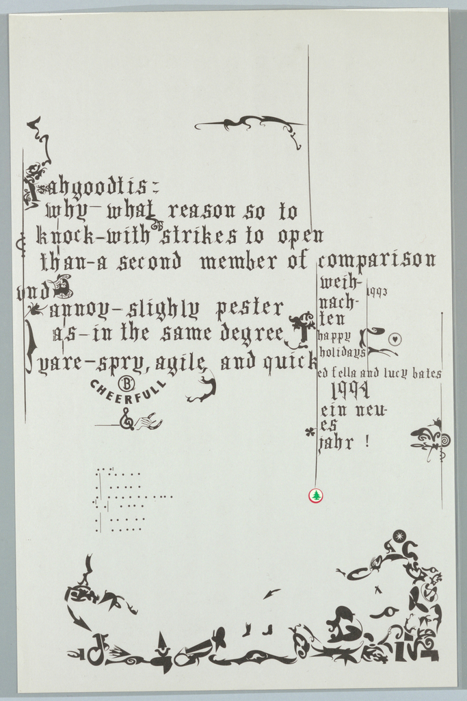 Recto: Imprinted in black across center: Fahgoodtis/ why-- what reason so to/ knock with strikes to open/ than a second member of comparison/ and/ annoy/ slightly pester/ as in the same degree/ vare-spry, agile, and quick/ "B"/ cheerfull; right edge, center: meih-/ 1993/ nach-/ ten/ happy/ holidays/ ed fella and lucy bates/ 1994/ ein nu-/ es/ jahr!