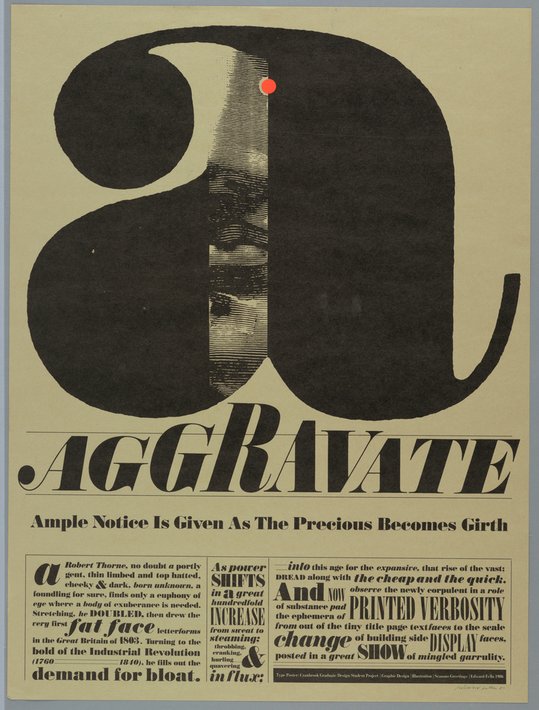 Imprinted in black across upper half of sheet: a; across center: AGGRAVATE/ ample Notice Is Given As The Precious Becomes Girth; across lower left quadrant: A Robert Thorne, no doubt a portly/ gent, thin limbed and top hatted/ cheeky & dark, born unknown, a/ fondling for sure, finds only a euphony of... [describes how Robert Thorne invented a typeface]... demand for bloat.; across lower quarter of sheet, center: As power/ SHIFTS/ in a great/ hundredfold/ INCREASE/ from sweat to/ steaming;/ throbbing,/ cranking,/ hurling/ & / quivering/ in flux;; across lower right quadrant: into this age for the expansive, that rise of the vast;/ DREAD along with the cheap an the quick./ AND NOW observe the newly corpulent ... [describes changing scale of typefaces]... of mingled garrulity.