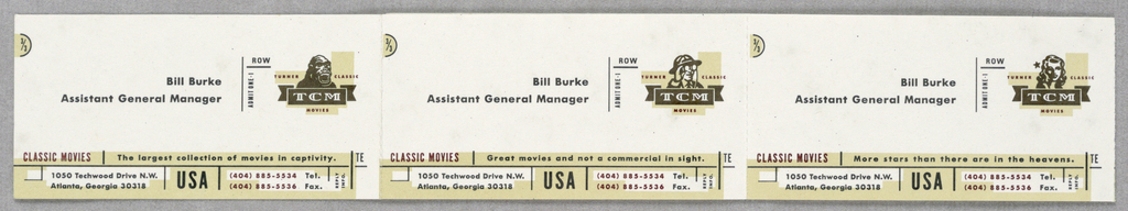Business Cards, Bill Burke, Assistant General Manager, Turner Classic Movies; Designed by Charles S. Anderson (1958), Paul Howalt, Joel Templin; Client: Turner Classic Movies; USA; offset lithograph on paper ; 1 3/16 x 17 7/16 in; Gift of Charles S. Anderson Design Company; 1996-29-14