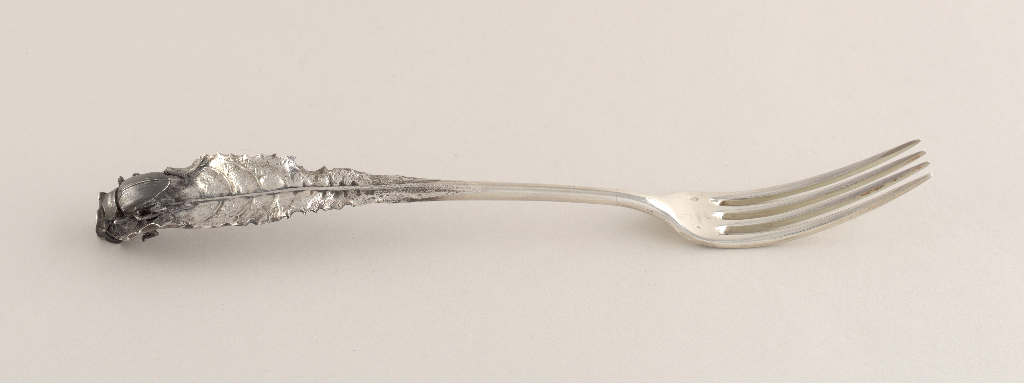 Dessert Fork wtih Beetle Clutching Mouse Fork; Manufactured by Charles Victor Gibert (French); France; silver; L x W x D: 19.4 × 2.3 × 2 cm (7 5/8 × 7/8 × 13/16 in.); Museum purchase from Smithsonian Institution Collections Acquisition Program, Decorative Arts Association Acquisition, and Sarah Cooper-Hewitt Funds; 1996-56-20