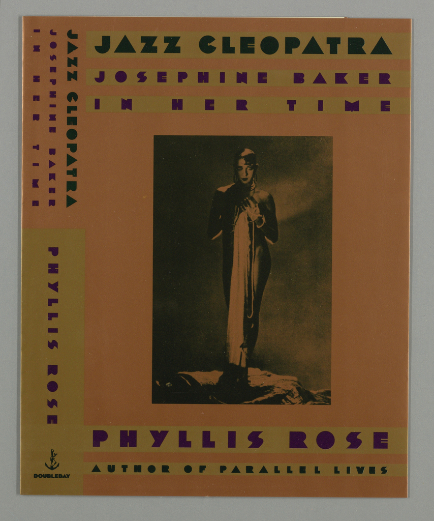 Printed in black and purple text, upper center: JAZZ CLEOPATRA / JOSEPHINE BAKER / IN HER TIME; in black and purple text, lower center: PHYLLIS ROSE / AUTHOR OF PARALLEL LIVES; in black and purple text, vertically, upper spine: JAZZ CLEOPATRA / JOSEPHINE BAKER / IN HER TIME; in purple text, lower spine: PHYLLIS ROSE