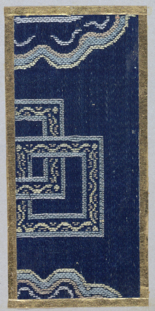 This is a Fragment. We acquired it in 1901. Its technique is 8-harness satin, plain weave. It is a part of the Textiles department.