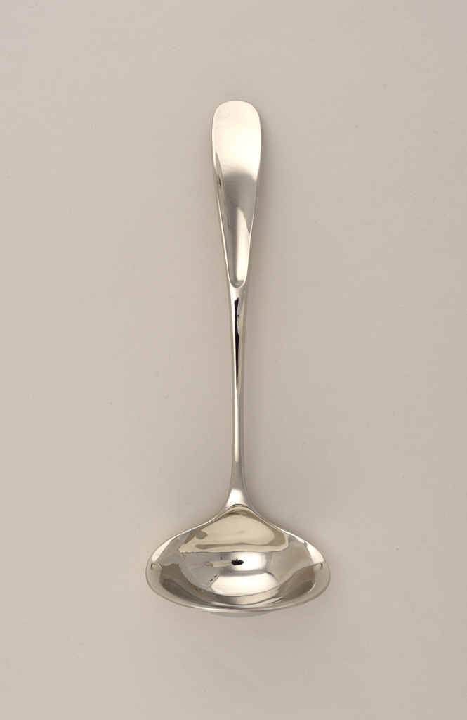 This is a Sauce ladle. It was manufactured by Georg Jensen Sølvsmedie and distributed by Royal Copenhagen Porcelain Manufactory. It is dated 1997 and we acquired it in 1998. Its medium is stainless steel. It is a part of the Product Design and Decorative Arts department.