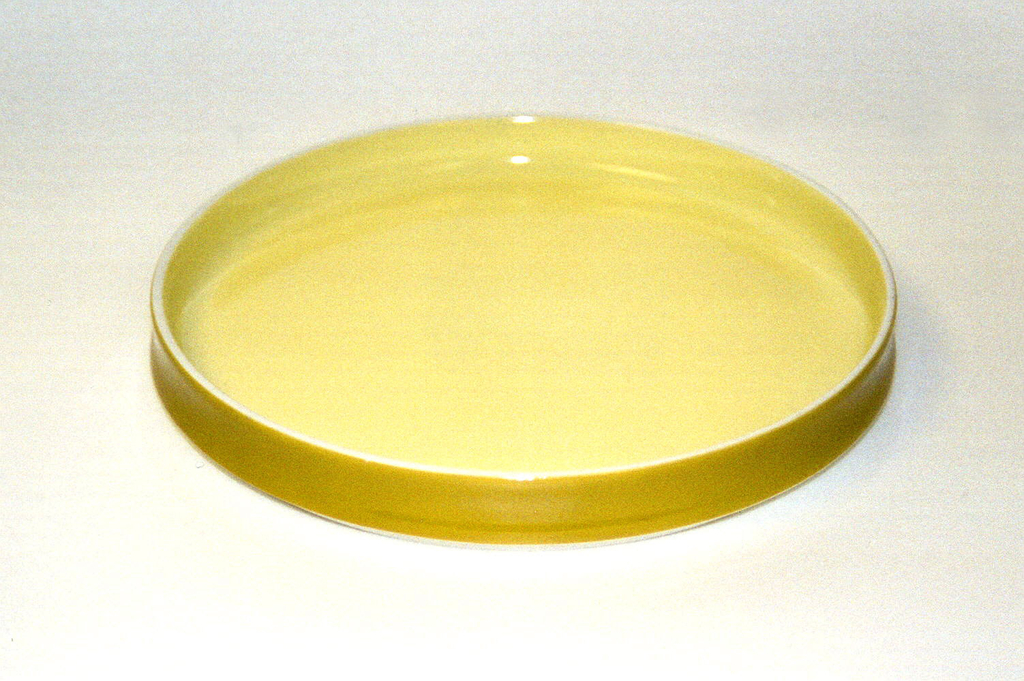 This is a plate. It was designed by Gerald Gulotta. It is dated designed 1970, marketed 1971–73 and we acquired it in 1999. Its medium is glazed porcelain. It is a part of the Product Design and Decorative Arts department.
