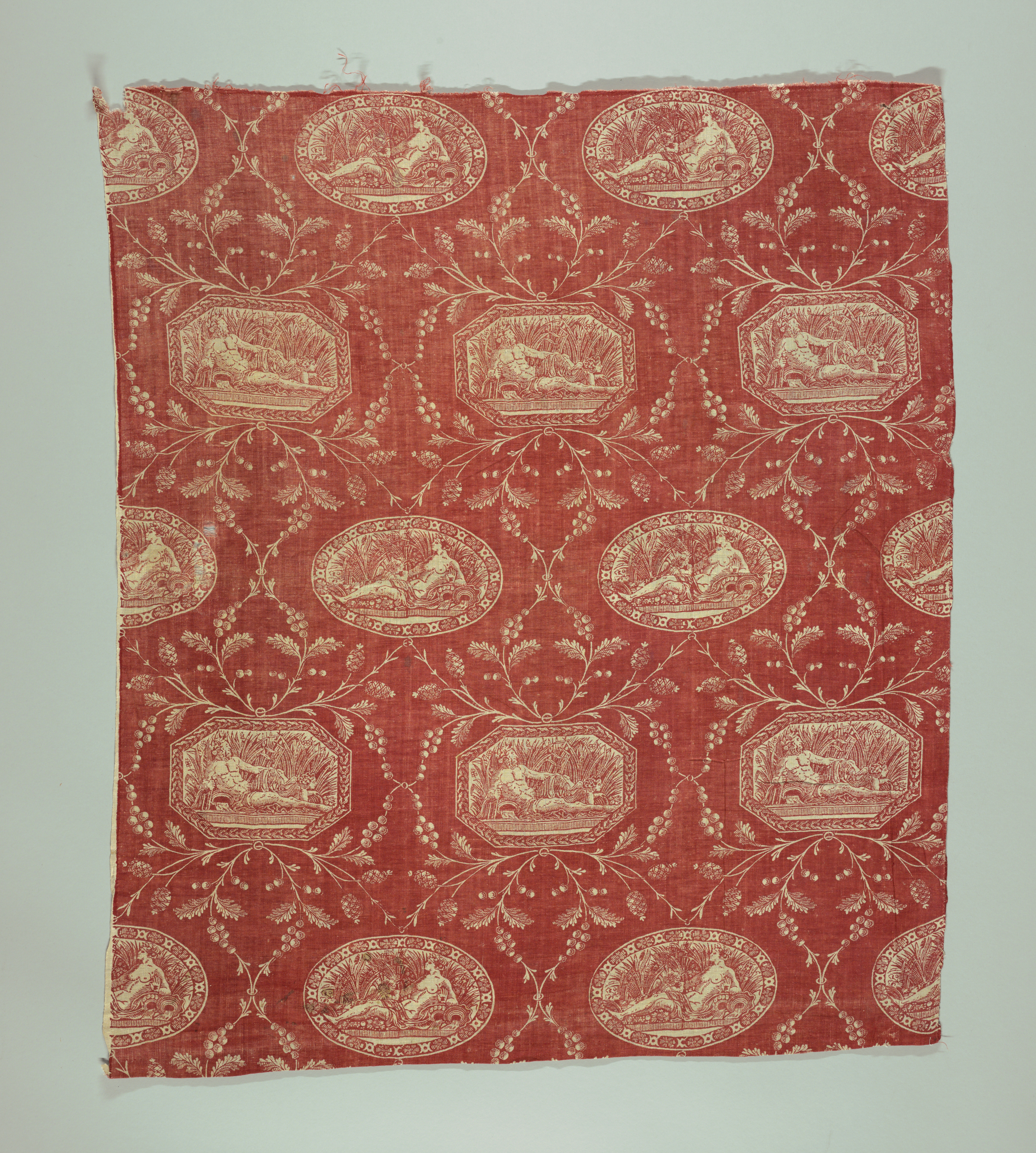 This is a Textile. It is dated 1780–1800 and we acquired it in 1995. Its medium is linen warp, cotton weft and its technique is block printed on plain weave. It is a part of the Textiles department.