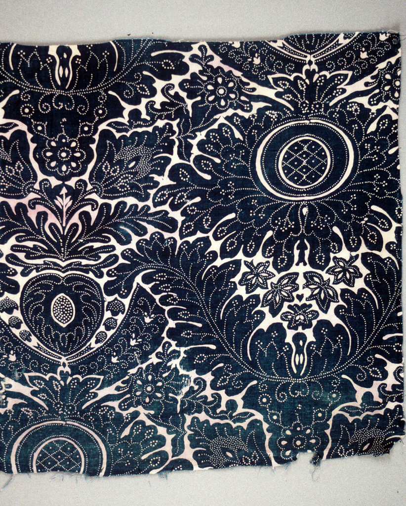 This is a Fragment. It is dated 1750–99 and we acquired it in 1995. Its medium is cotton and its technique is block printed using resist then vat dyed in indigo on plain weave. It is a part of the Textiles department.
