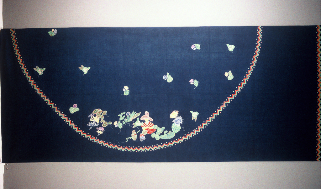 This is a panel. It is dated mid-20th century and we acquired it in 1995. Its medium is cotton and its technique is hand drawn and mechanical resist, paint and immersion dyed on plain weave (batik). It is a part of the Textiles department.