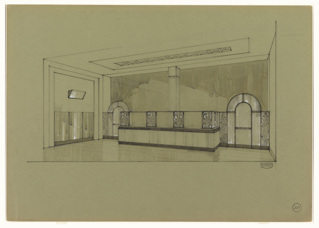 Drawing, Design for Lobby in the Art Deco Style; Designed by Kilemnik & Cia (Argentina); graphite, brush and brown watercolor, white gouache, white chalk on green paperboard; 48.9 x 68.9 cm (19 1/4 x 27 1/8 in. ); Gift of Maureen Cogan; 1999-39-5