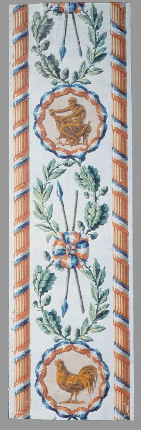 There are a number of wallpapers in the museum collection produced during the French Revolution period, but this is the only border paper. The design contains numerous symbols of the Revolution. There are two medallions, each framed in scalloped tricolor ribbons. The top medallion contains Hercules, sitting on a stool with his club and lion pelt, trying to bend fasces. The second medallion contains a cock, standing at attention and very alert. I want to point out the orange highlights on each these which give them the look of bronze, and they glow when shown against the light blue background. Similar effect with the white highlights on the tricolor ribbons, where that little sparkle creates the appearance of satin. The medallions are separated by a pair of crossed pikes with a cockade at their center, enframed in oak and laurel leaves. Running down the sides are columns of fasces wrapped in tricolor ribbons. The French Revolution papers I have seen are all beautifully designed and printed and would definitely garner attention and respect.