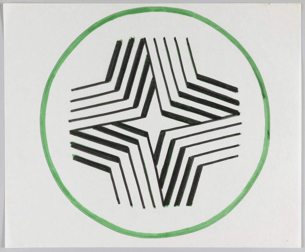 This is a Drawing. It was designed by Dan Friedman. It is dated ca. 1975 and we acquired it in 1997. Its medium is green, black marking pen on white tracing paper. It is a part of the Drawings, Prints, and Graphic Design department.
