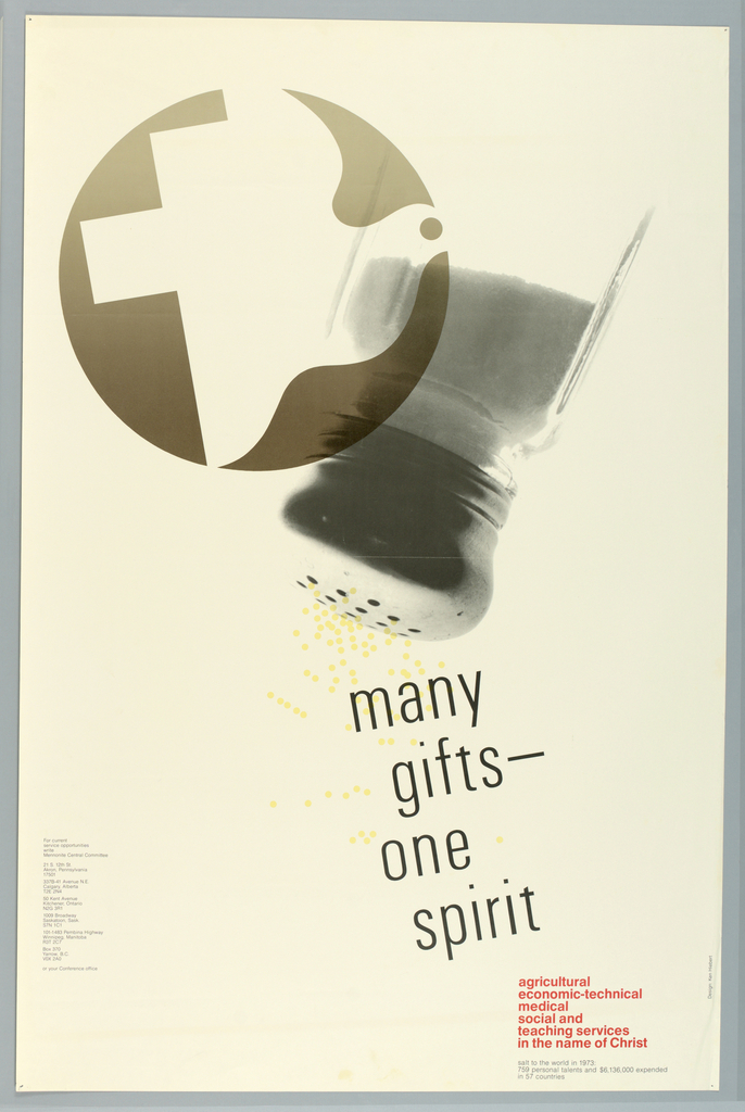 Poster, Many Gifts One Spirit for the Mennonite Central Committee; Designed by Kenneth Hiebert (American, b.1930); offset lithograph on white wove paper; 96.5 x 63.8 cm (38 x 25 1/8 in. ); Gift of Ken Friedman; 1997-19-203