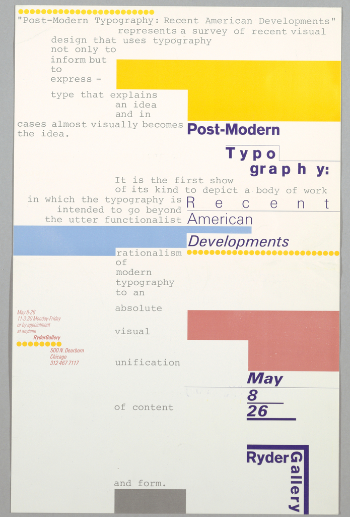 Printed in grid format across surface of poster: [24 yellow dots] / "Post-Modern Typography: Recent American Developments" / represents a survey of recent visual / designs that uses typography / not only to / inform but / to / express - / type that explains / an idea / and in / cases almost visually becomes / the idea. / It is the first show / of its kind to depict a body of work / in which the typography is / intended to go beyond / the utter functionalist / rationnalism / [27 yellow dots] / of / modern / typography / to an / absolute / visual / unification / of content / and form. At center left in red: May 8-26 / 11-3:30 Monday-Friday / or by appointment / at anytime/ Ryder Gallery/ [8 yellow dots] / 500 N. Dearborn / chicago / 312 467 7117