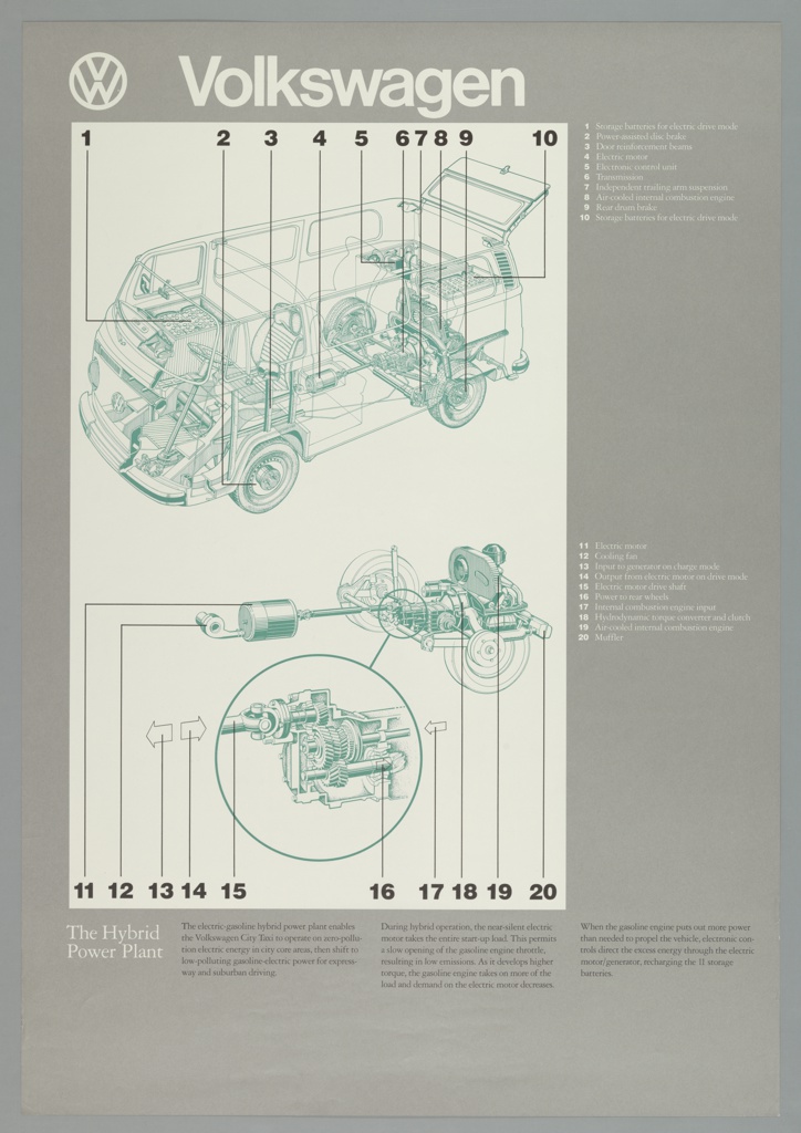 Imprinted in white at right side, two sections of text numbered 1-10 and 11-20 as follows: 1 Storage batteries for electric drive mode / 2 Power-assisted disc brakes / 3 Dor reinforcement beams / 4 Electric motor / 5 Electronic control unit / 6 Transmission / 7 Independent trailing arm suspension / 8 Air-cooled internal combustion engine / 9 Rear drum brakes / 10 Storage batteries for electric drive mode. / 11 Electric motor / 12 Cooling fan / 13 Input to generator on charge mode / 14 Output from electric motor on drive mode / 15 Electric motor drive shaft / 16 Power to rear wheels /17 Internal combustions engine input / 18 Hydrodynamic torque convertor and clutch / 19 Air-cooled internal combustion engine / 20 Muffler. Imprinted in white lower left: The Hybrid/Power Plant. Imprinted in black[first column of text]: The electric-gasoline hybrid power plant enables / the Volkeswagen City Taxi to operate on zero-pollu-/tion electric energy in city core areas, then shift to / low polluting gasoline -electric power for express- / way and suburban driving. [second column of text]: During hybrid operation, the near-silent electric / motor takes the entire start-up load. This permits / a slow opening of the gasoline engine throttle, /resulting in low gas emissions. As it develops higher / torque, the gasoline engine takes on more of the / load and demand on the electric motor decreases. [third column of text]: When the gasoline engine puts out more power / than needed to propel the vehicle, electronic con- / trols direct the excess energy through the electric / motor generator, recharcing the 11 storage batteries.