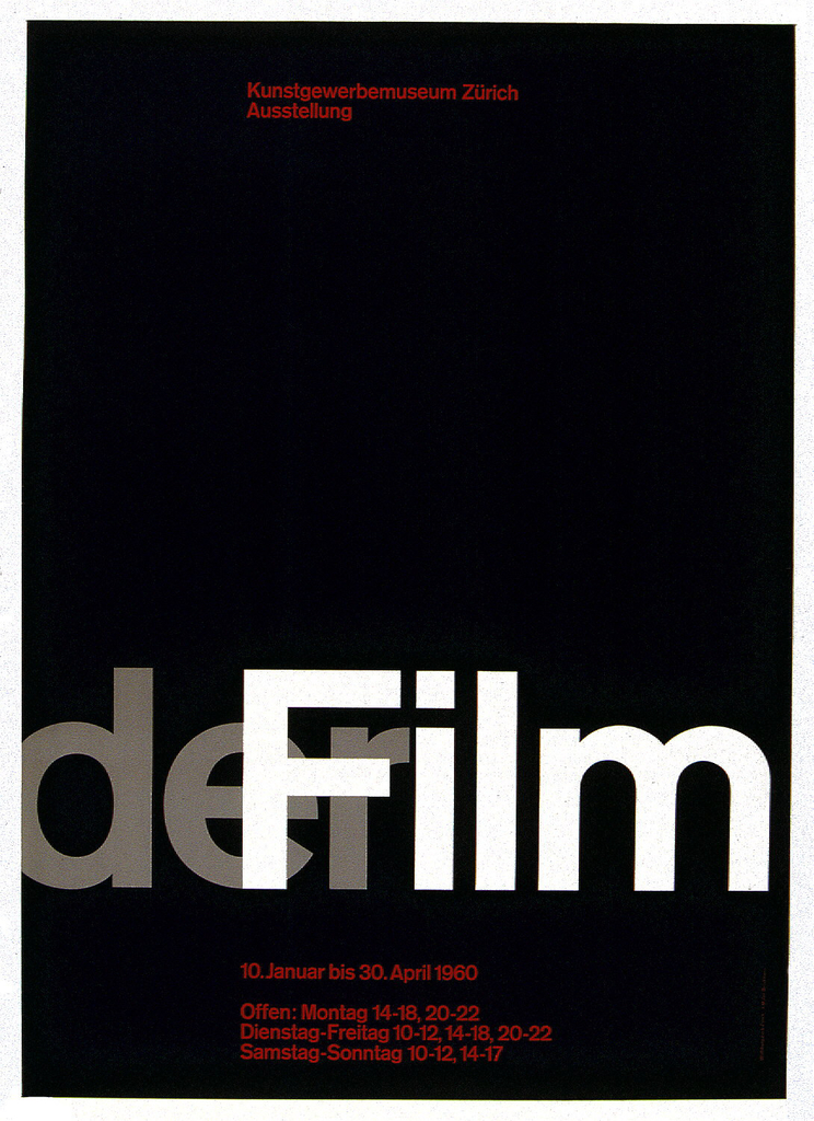 This poster is considered a masterpiece of modernist design. By overlapping the word “Film” with the article “der” [the], Josef Müller-Brockmann used typography to explore the principle of cinematic montage. The gray letters occupy a space behind (and a time before) the white text.