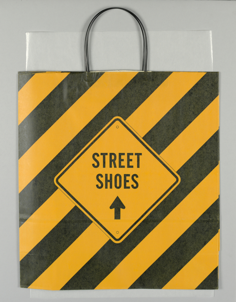 Shopping Bag, Street Shoes; Designed by Dan Friedman (American, 1945–1995); offset lithograph on white paper;two black plastic handles; 50.6 x 45.7 cm (19 15/16 x 18 in. ); Gift of Ken Friedman; 1997-19-397