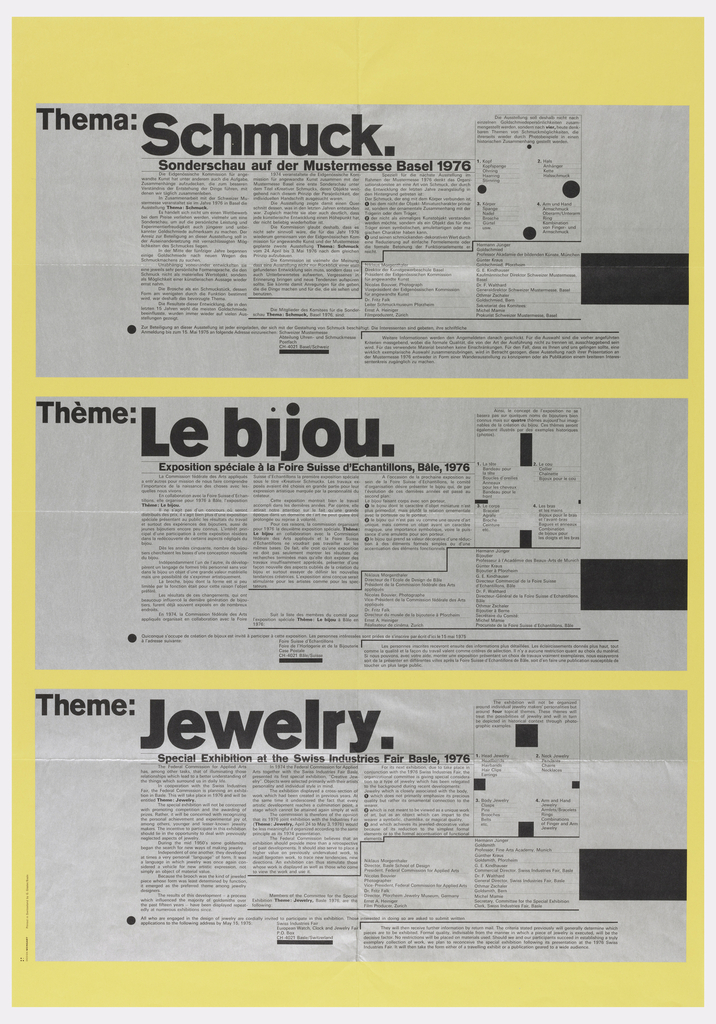 Imprinted in black [English section only]: Theme: Jewelry. / Special Exhibition at the Swiss Industrils Fair Basle, 1976 / The Federal Commission for Applied Arts / has, among other tasks, that of illuminating those / relationships which lead to a better understanding of / the things which surround us in daily life. / In cooperation with the S.I. / Fair, the Federal Commission is planning an exhibi- / tion in Basle. This will take place in 1976 and will be / entitled Theme: Jewelry. The special exhibition will not be concerned / with promoting competition and the awarding of / prizes. Rather, it will be concerned with recogonizing / the personal achievment and personal joy of, / among others, younger and lesser-known jewelry / makers. The incentive to participate in this exhibition / should lie in the opportunity to deal with previouosly / neglected aspects of jewelry. / During the mid 1950's some goldsmiths / began the search for new ways of making jewelry. / Independent of one another, they developed / at times a very personal "language" of form. It was / a language in which jewelry was once again con- / sidered a vehicle for new artistic expression, not simply an object of material value. / Because the brooch was the kind of jeweled / piece whose form was least determined by function, / it emerged as the preferred theme among jewelry designers. The results of this development- a process / which influencd the majority of goldsmiths over / the past fifteen years - have been displayed repeat- / edly at numerous exhibitions since.