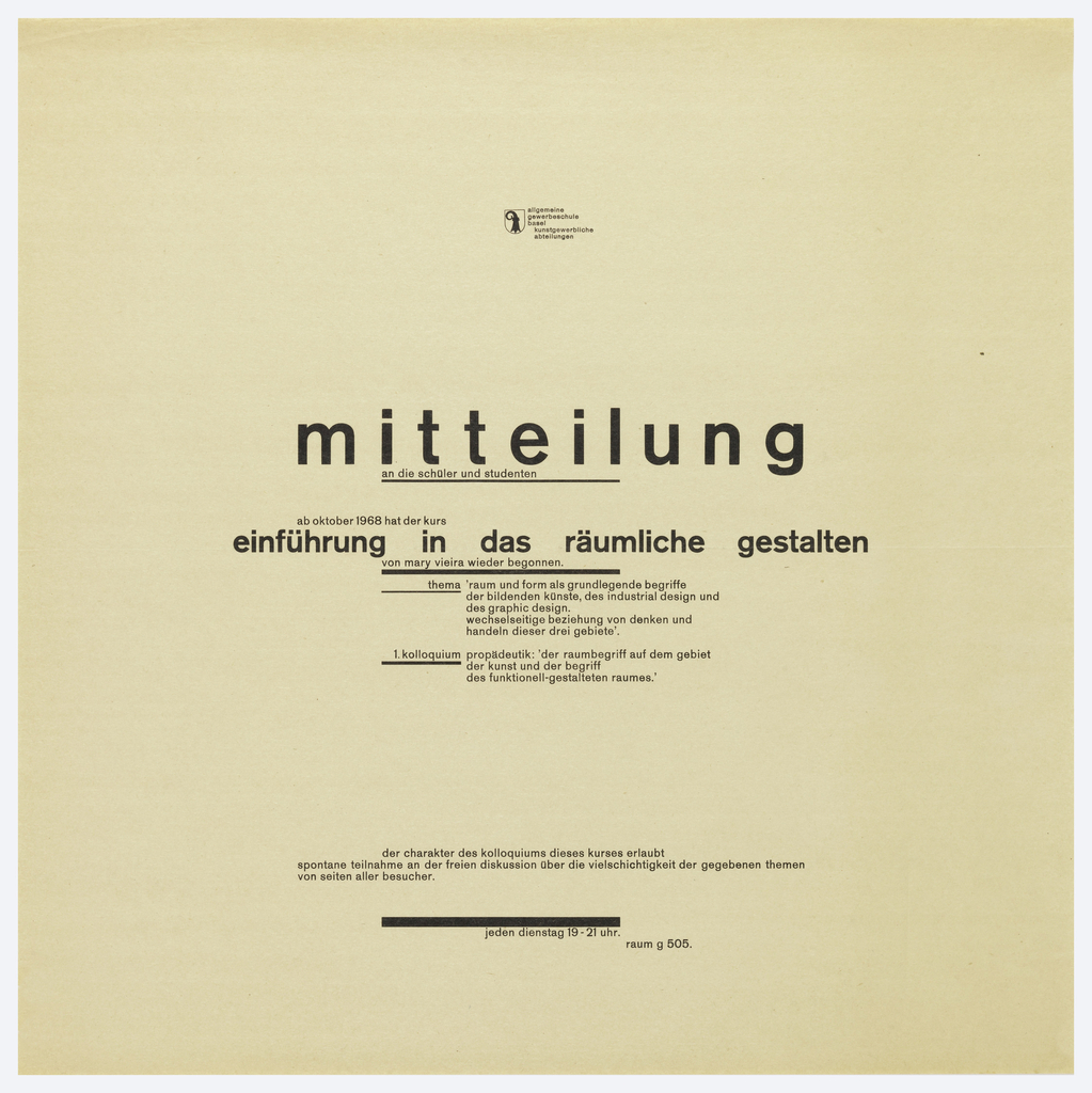 Inscribed in black below heavy line lower center: jeden dienstag 19-21 uhr. / raum g 505. Inscribed upper center: allegemeine / gewerbeschule / basel / kunstgewerbliche / abteilungen (Basel School of Arts and Crafts)