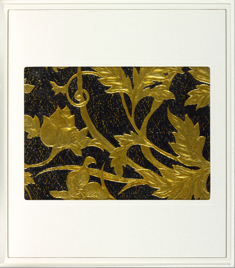 This is a Imitation leather. It is dated 1990–95 and we acquired it in 1998. Its medium is embossed paper. It is a part of the Wallcoverings department.