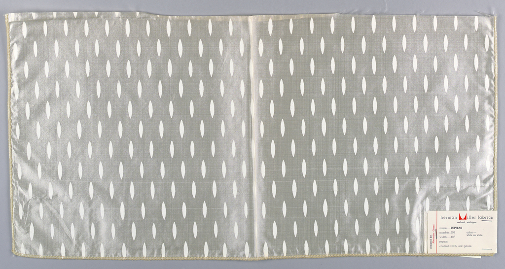 This is a Sample. It was designed by Alexander Hayden Girard and manufactured by American Art Textile Printing Company, Inc. and produced by Herman Miller Textiles. It is dated 1952 and we acquired it in 1969. Its medium is silk and its technique is screen printed on plain weave. It is a part of the Textiles department.