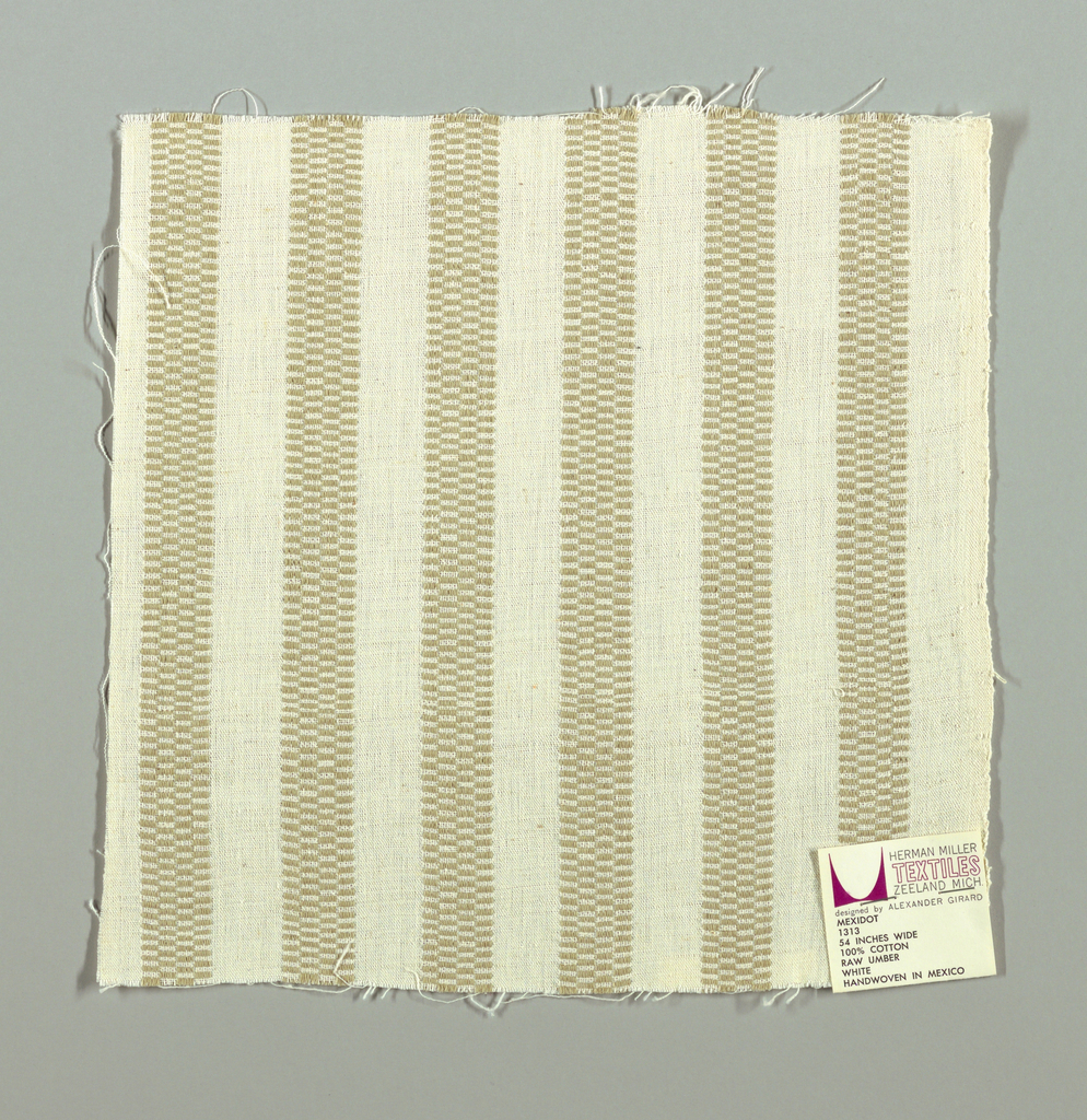 This is a Sample. It was designed by Alexander Hayden Girard and produced by Herman Miller Furniture Company. It is dated 1963 and we acquired it in 1969. Its medium is cotton and its technique is plain weave with supplementary warp patterning. It is a part of the Textiles department.