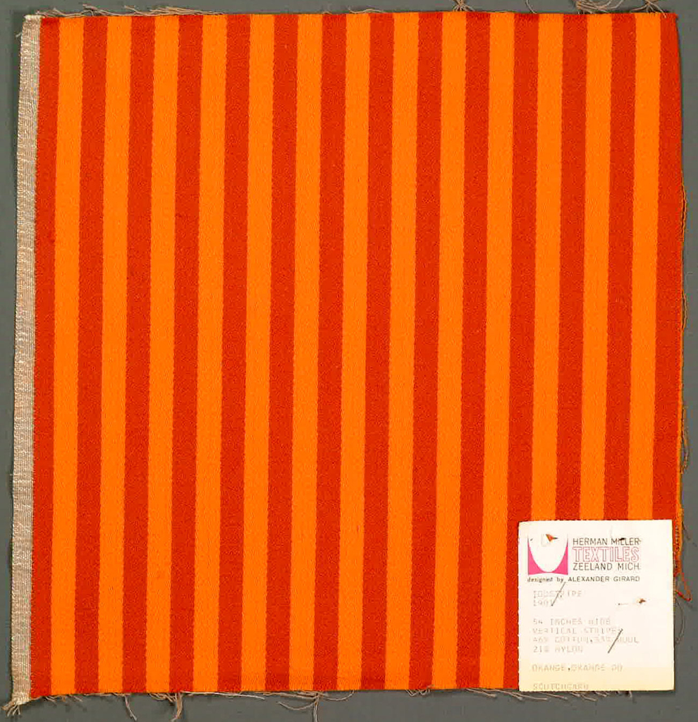 This is a Sample. It was designed by Alexander Hayden Girard and produced by Herman Miller Furniture Company. It is dated 1965 and we acquired it in 1969. Its medium is cotton (46%), wool (33%), and nylon (21%) and its technique is warp-faced twill. It is a part of the Textiles department.
