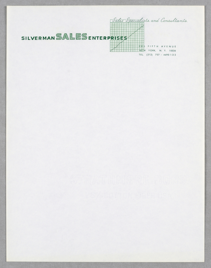Letterhead, Silverman Sales Enterprises, New York; Graphic design by Unknown (American); USA; letterpress: green ink on white wove paper; 27.9 x 21.6 cm (11 x 8 1/2 in. ); Gift of Thomas F. O'Malley; 1999-59-22