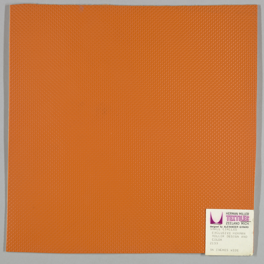 This is a Sample. It was designed by Alexander Hayden Girard and produced by Herman Miller Furniture Company. It is dated 1967 and we acquired it in 1969. Its medium is vinyl-coated cotton (naugahyde) and its technique is cotton knit coated with vinyl and embossed. It is a part of the Textiles department.