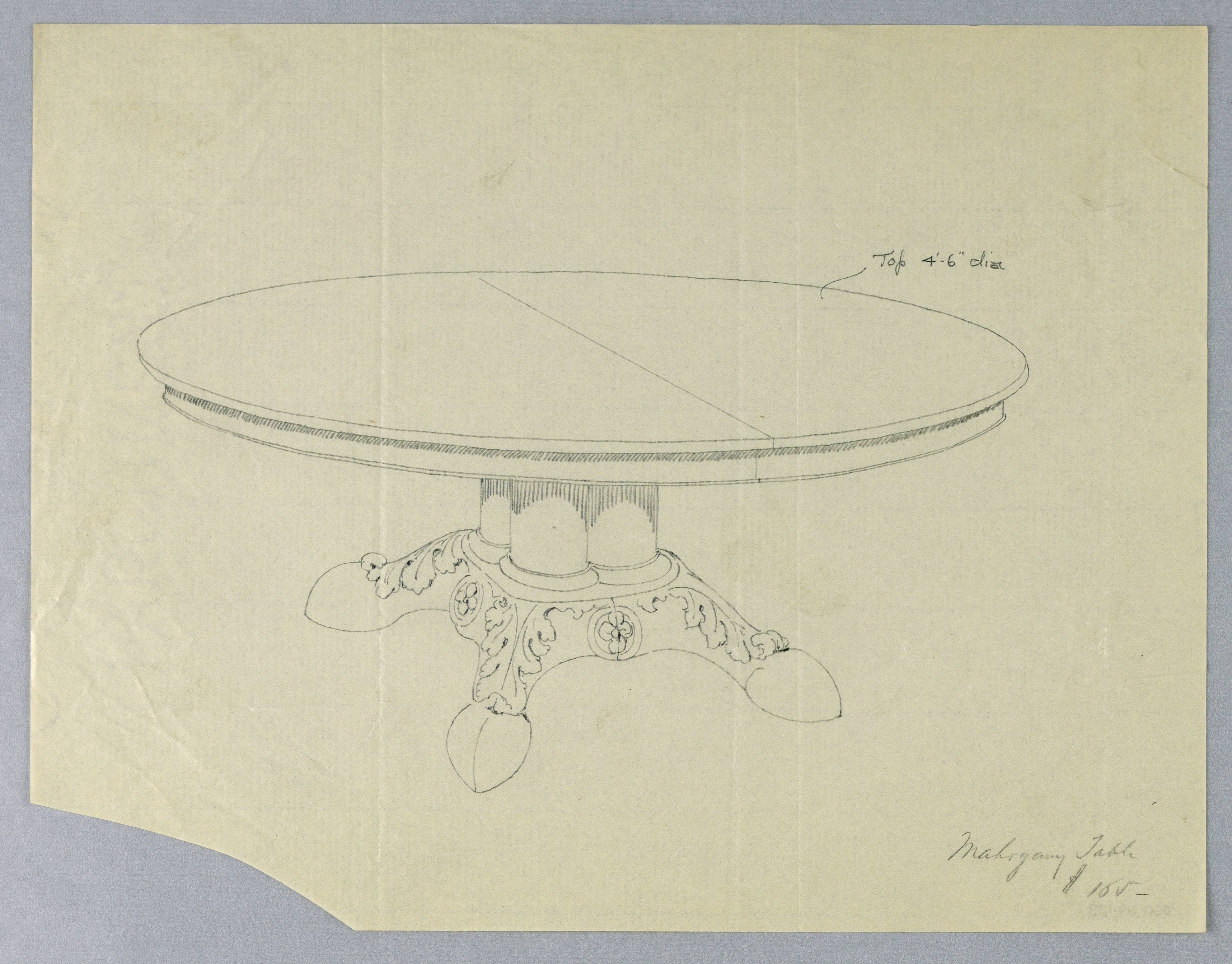 Inscribed in graphite, upper right of image, with arrow pointing to table top: Top 4'-6" disc; in graphite, lower right corner: Mahogany Table / $165