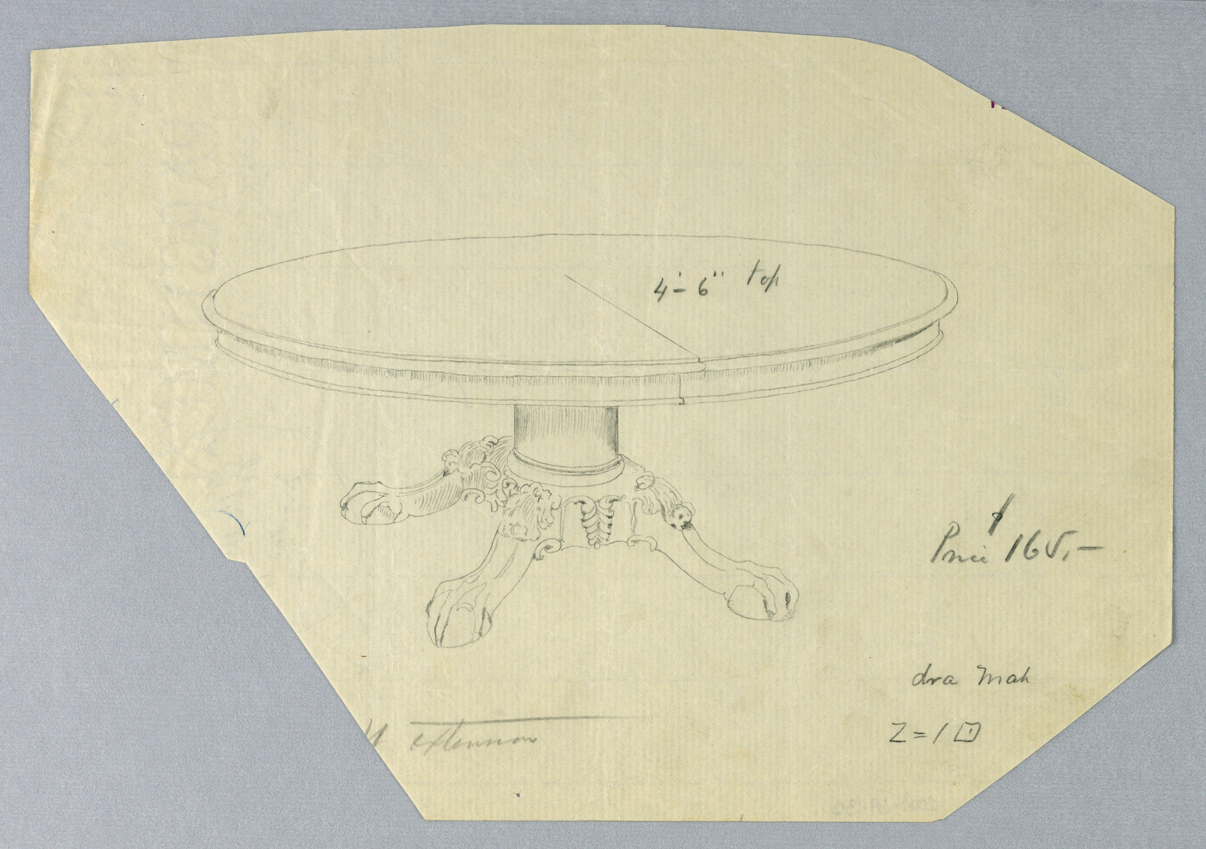 Inscribed in graphite, upper center of image: 4'-6"; in lower right quadrant: Price $165- / dva Mah / Z=1[box with dot in center]; on verso, center right: Table M (:tear) / Marked D / (:tear)