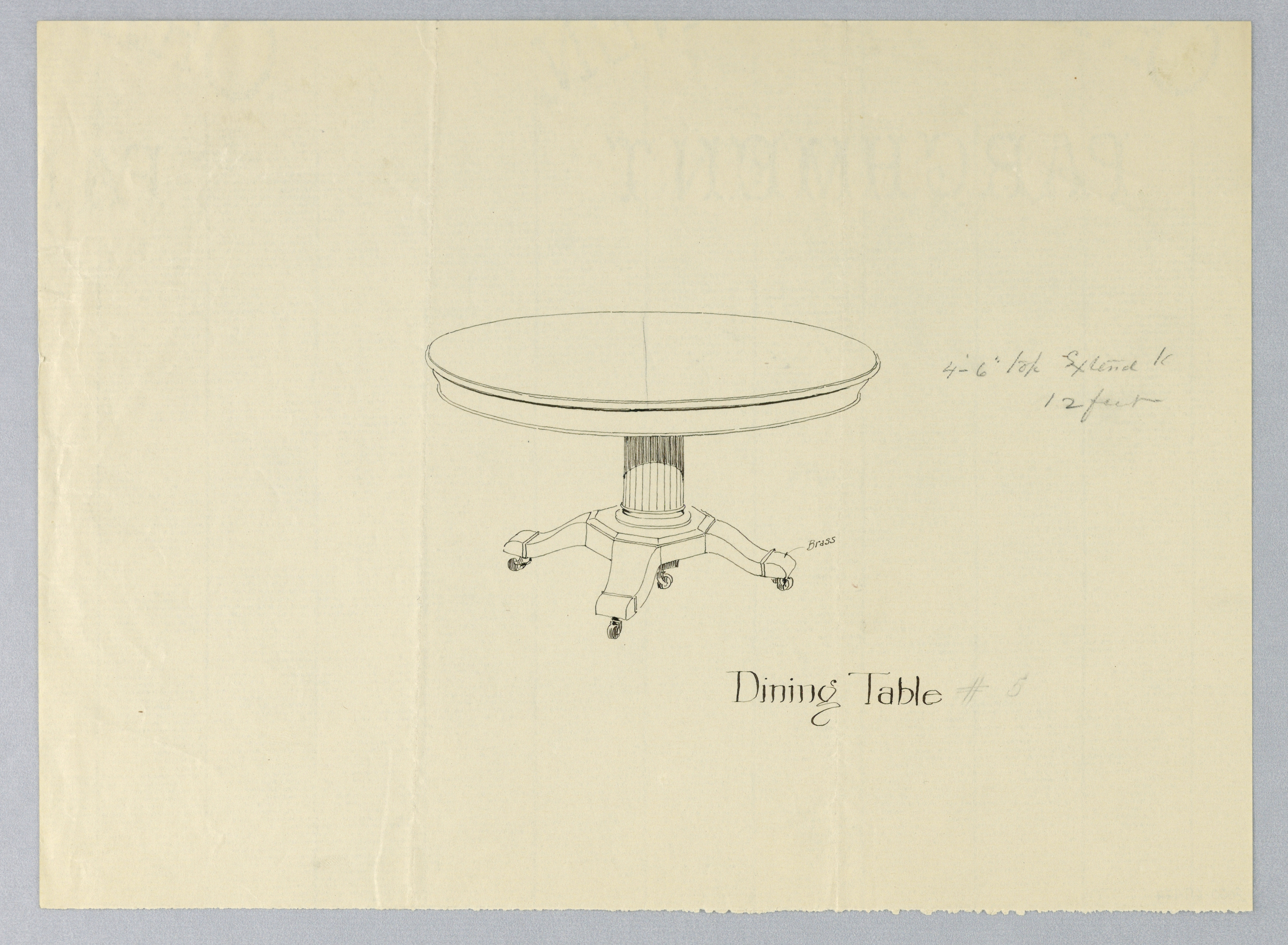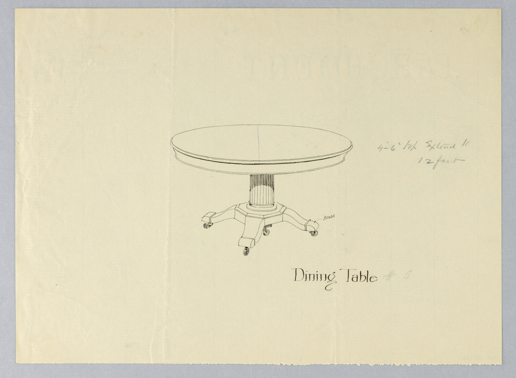 Inscribed in pen and black ink, lower right: Dining Table; at lower right of image with arrow pointing to right foot: Brass; in graphite, upper right of image: 4'-6" top Extend to 12 feet