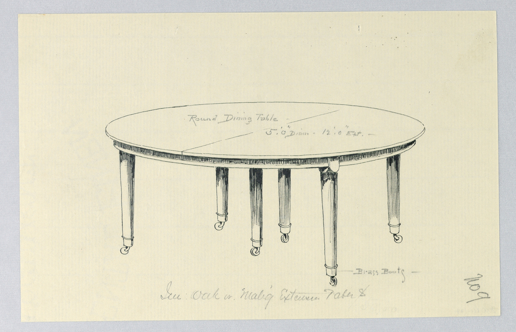 Inscribed in graphite, upper center of image: Round Dining Table / 5'. 0" Diam - 12," 0" Ext-; at lower right if image with arrow pointing to foot above caster: Brass Boots-; along bottom of sheet, center: [illeg.] Oak or Mah'g Extension Table; at lower right corner of sheet: No 9