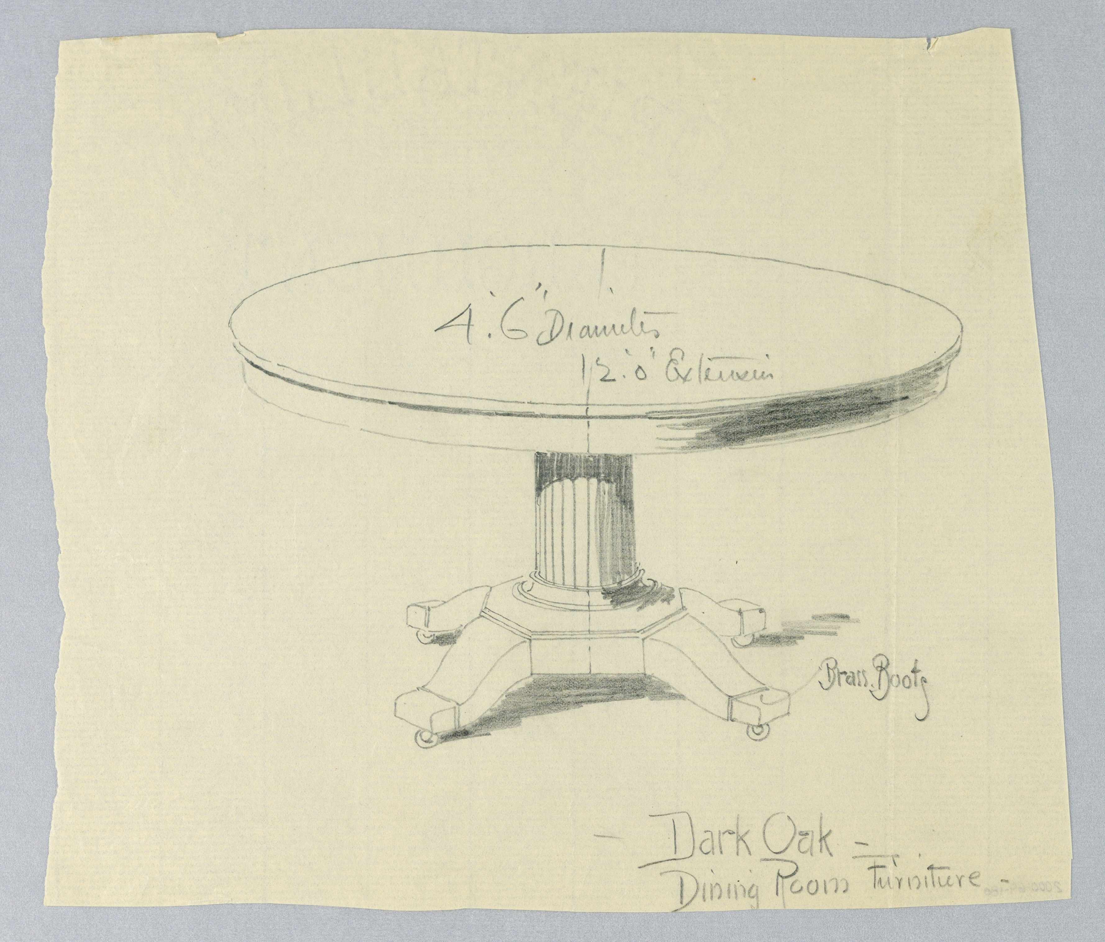 Drawing, Design for Dark Oak Dining Room Table; Designed by A.N. Davenport Co.; graphite on thin cream paper; 20.3 x 22.9 cm (8 x 9 in. ); Gift of The Lake St. Louis Historical Society; 2000-69-180