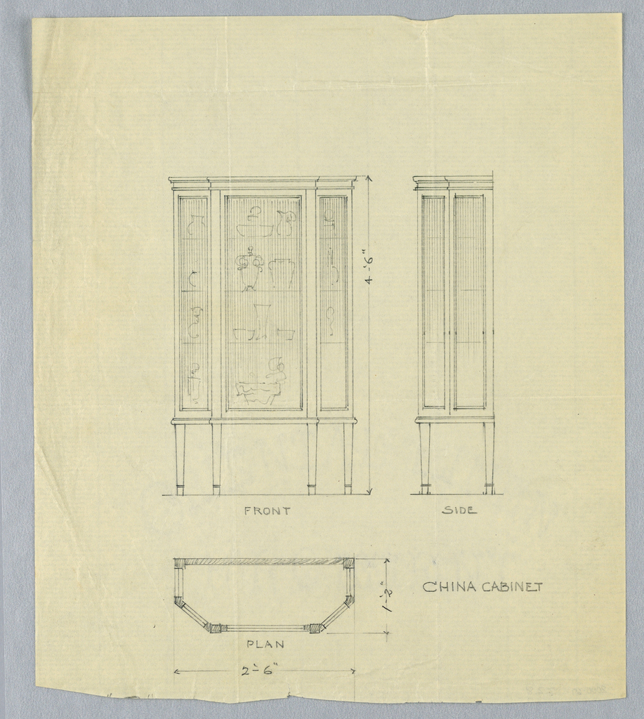 Drawing, Design for China Cabinet in Three Views; Designed by A.N. Davenport Co.; graphite on thin cream paper; 24.4 x 21.0 cm (9 5/8 x 8 1/4 in. ); Gift of The Lake St. Louis Historical Society; 2000-69-228