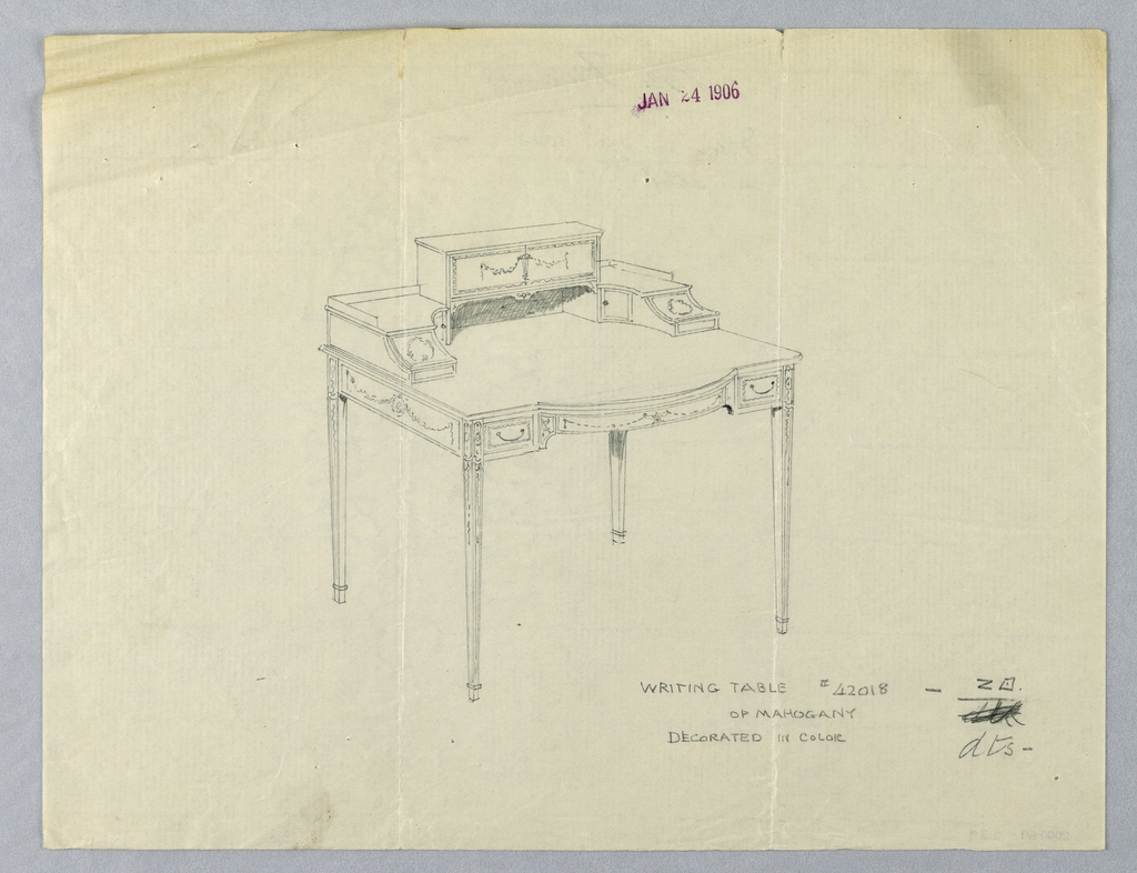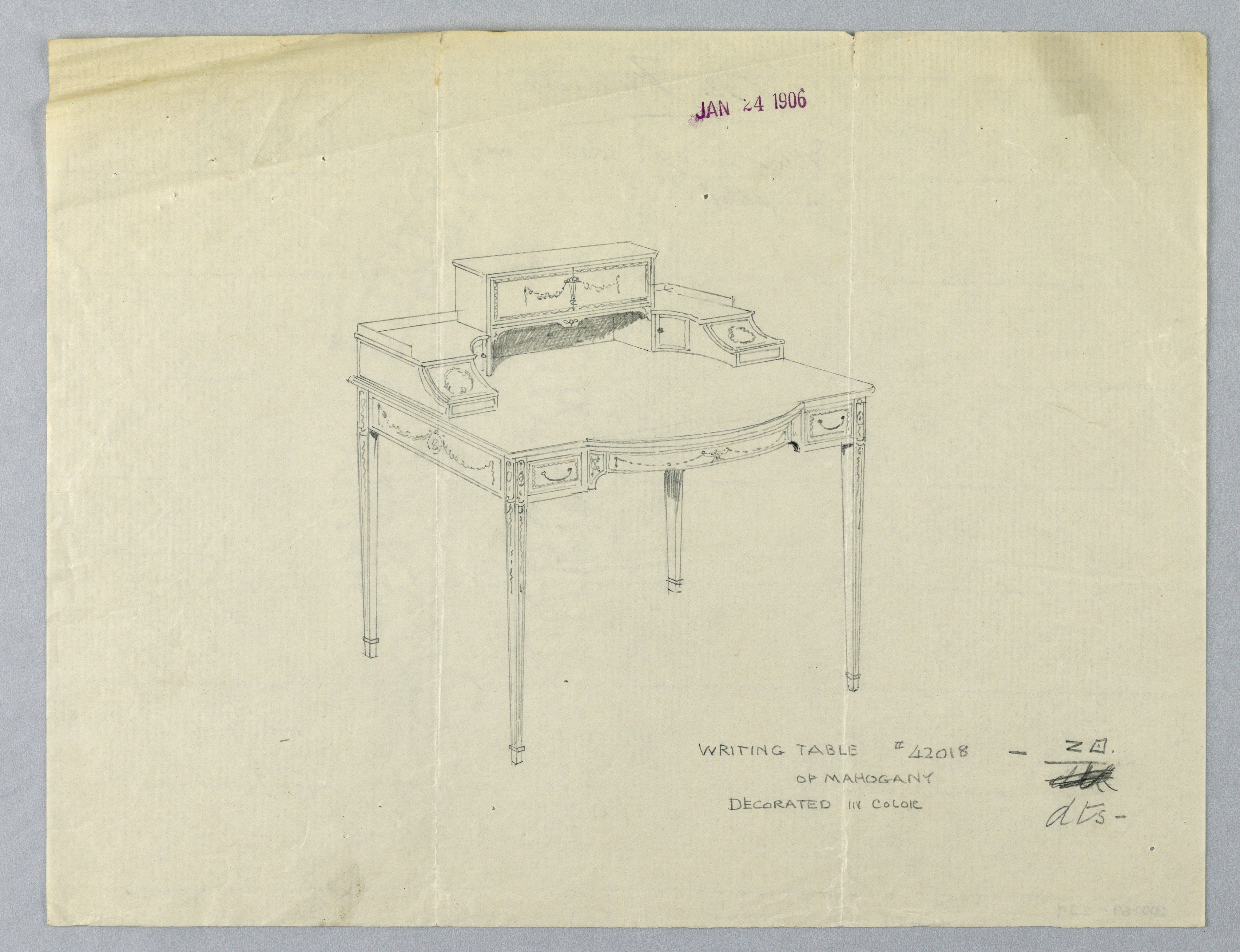 Drawing, Design for Writing Table #42018 of Mahogany, Decorated in Color