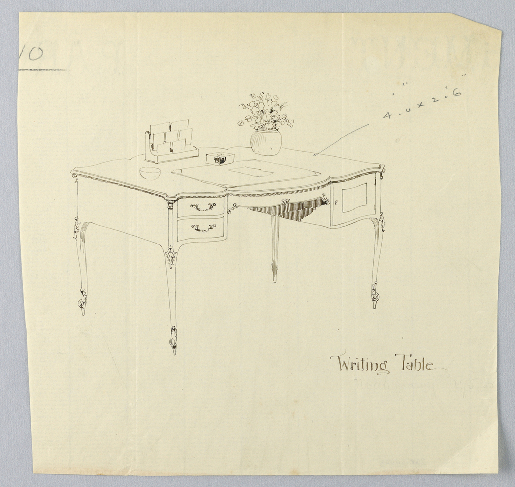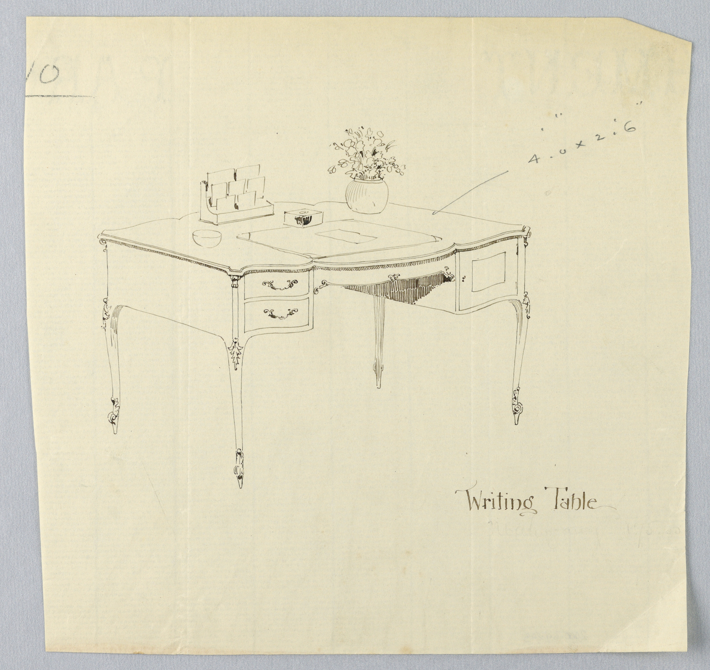 Drawing, Design for Writing Table with Scalloped Front and Vase of Flowers; Designed by A.N. Davenport Co.; pen and black ink, graphite on thin cream paper; 19.7 x 21.0 cm (7 3/4 x 8 1/4 in. ); Gift of The Lake St. Louis Historical Society; 2000-69-293