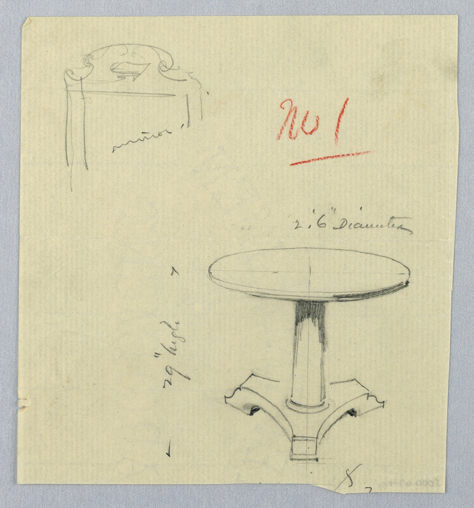 Drawing, Design for Small Round Table with Baluster Supports on Three Scrolling Legs; Designed by A.N. Davenport Co.; Gift of The Lake St. Louis Historical Society; 2000-69-446