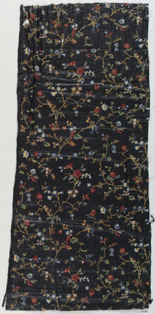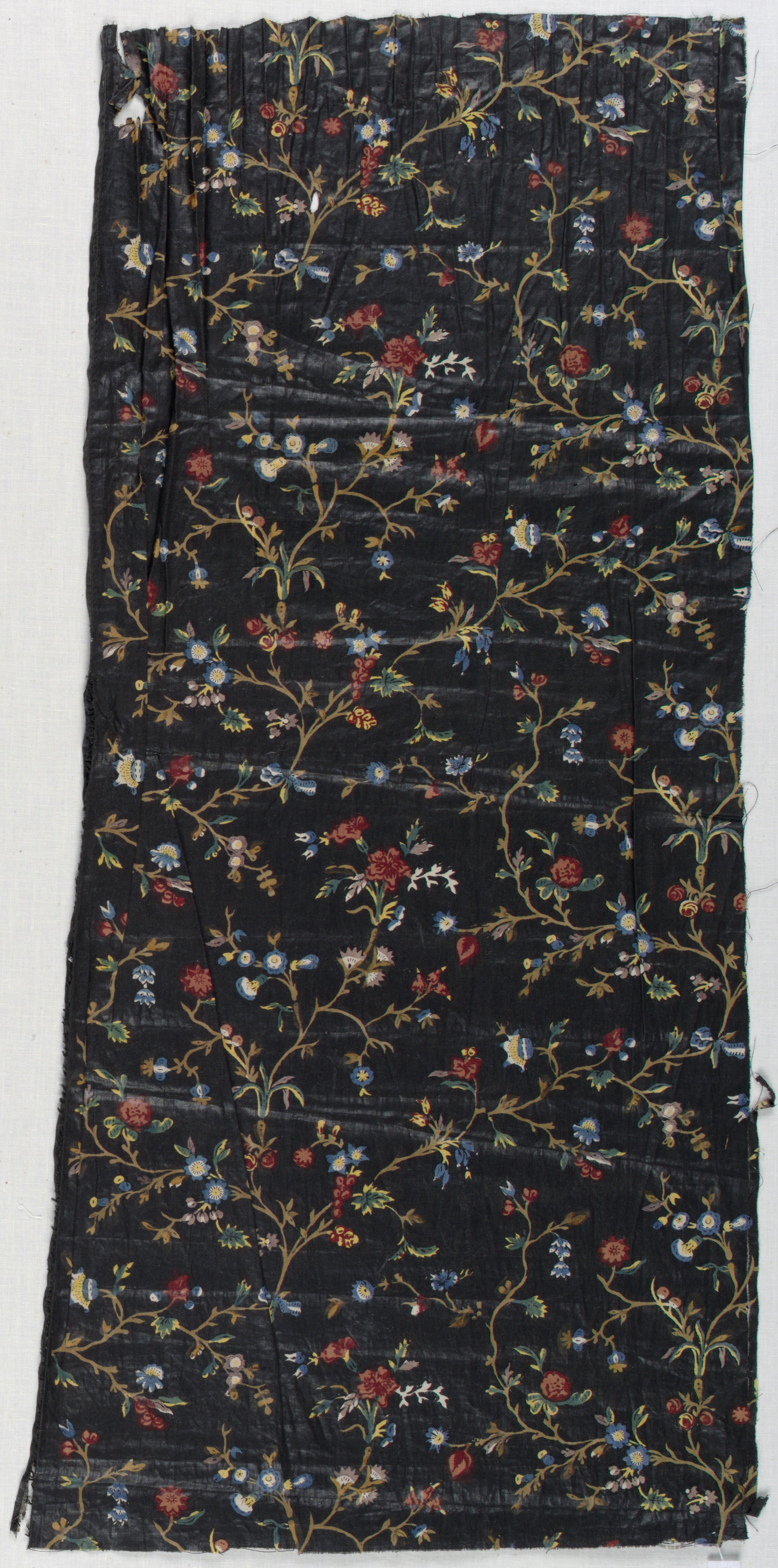 This is a Fragment. It is dated 1750–1800 and we acquired it in 2000. Its medium is cotton and its technique is block-printed on plain weave in seven colors; mauve, yellow, brown, blue, two reds and black. It is a part of the Textiles department.