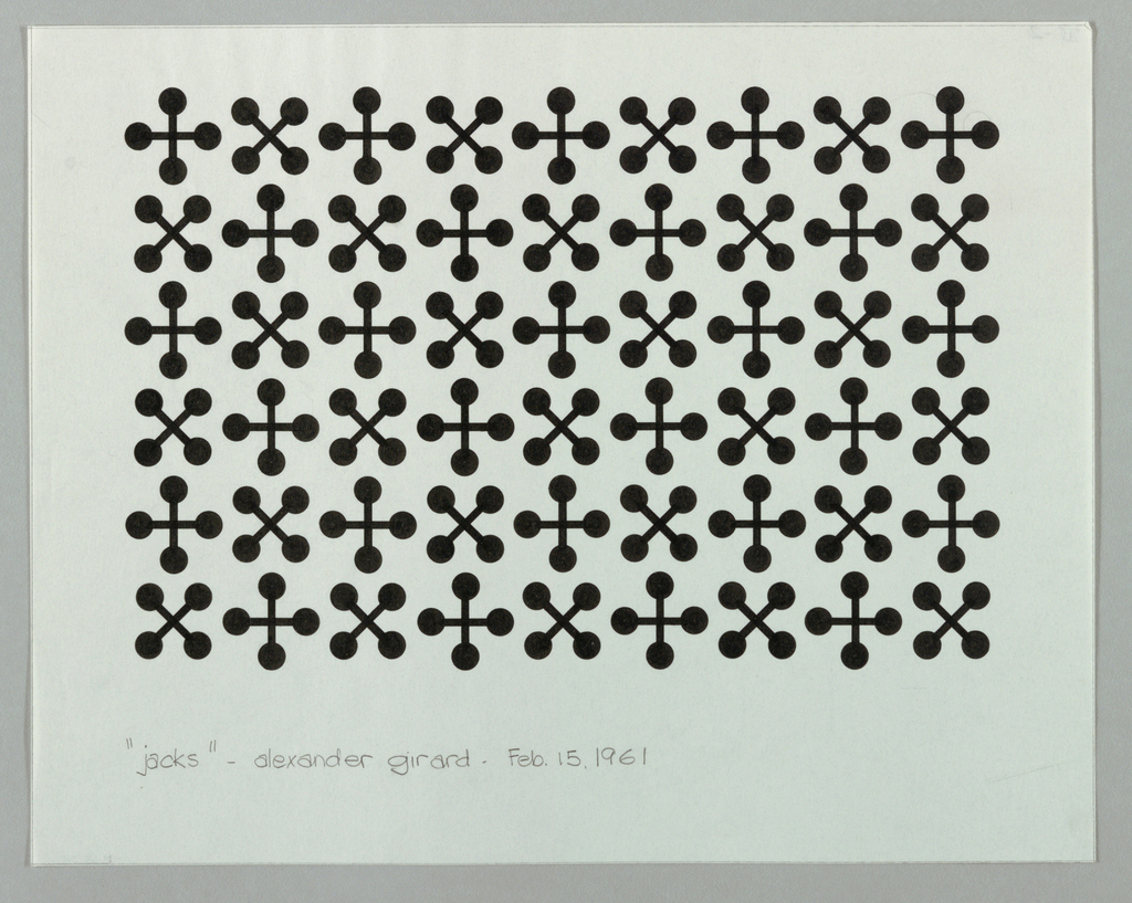 Drawing, Textile Design: Jacks; Designed by Alexander Hayden Girard (American, 1907–1993); Office of Herman Miller Furniture Company (United States); pen and black ink, graphite on white wove paper; 27.3 x 34.8 cm (10 3/4 x 13 11/16 in.); Gift of Alexander H. Girard; 1969-165-378