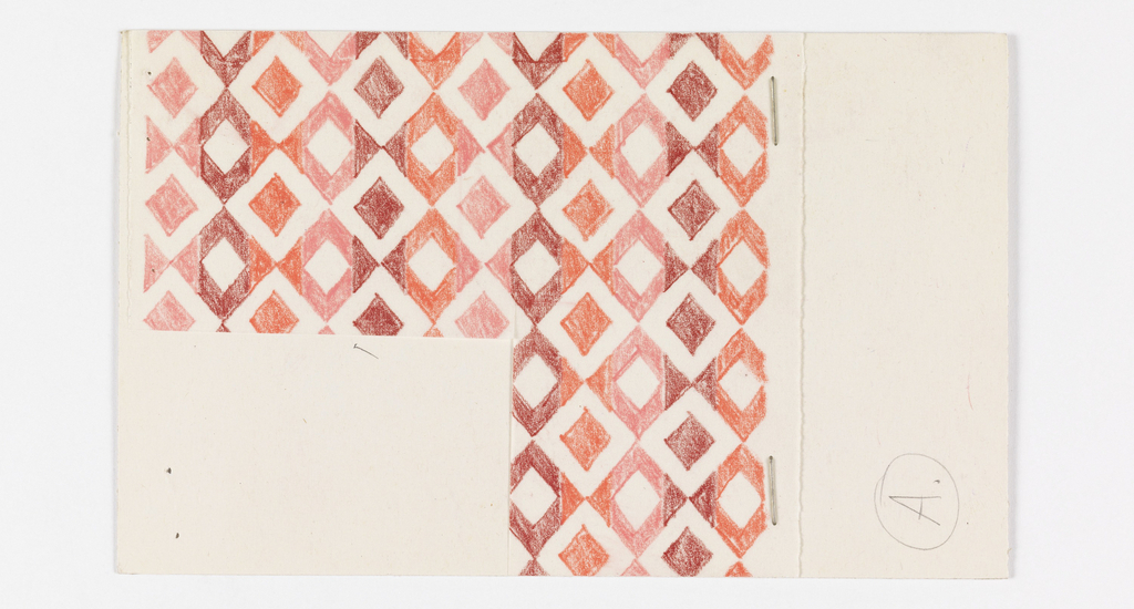 Drawing, Textile Design: Inventory Card; Designed by Alexander Hayden Girard (American, 1907–1993); Office of Herman Miller Furniture Company (United States); USA; pink, red color pencil on white tracing paper fastened to white cardboard with two staples; 10 x 12.4 cm (3 15/16 x 4 7/8 in.) Mount: 10 x 16.4 cm (3 15/16 x 6 7/16 in.); Gift of Alexander H. Girard; 1969-165-424