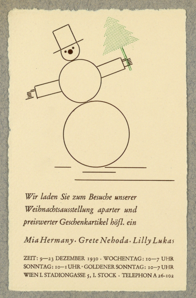 Invitation, Wir laden Sie zum Besuche Unserer Weihnachtsausstellung... Mia Hermany, Greta Nehoda, Lilly Luka, December 1930; Designed by Mia Hermany (Austrian), Grete Nehoda (Austrian,), Lilly Lukas (Austrian,); Published by Jahoda & Siegel (Austria); letterpress in brown and green ink on cream wove paper, mounted on grey-blue wove paper; Gift of James Howard Fraser; 2000-68-98