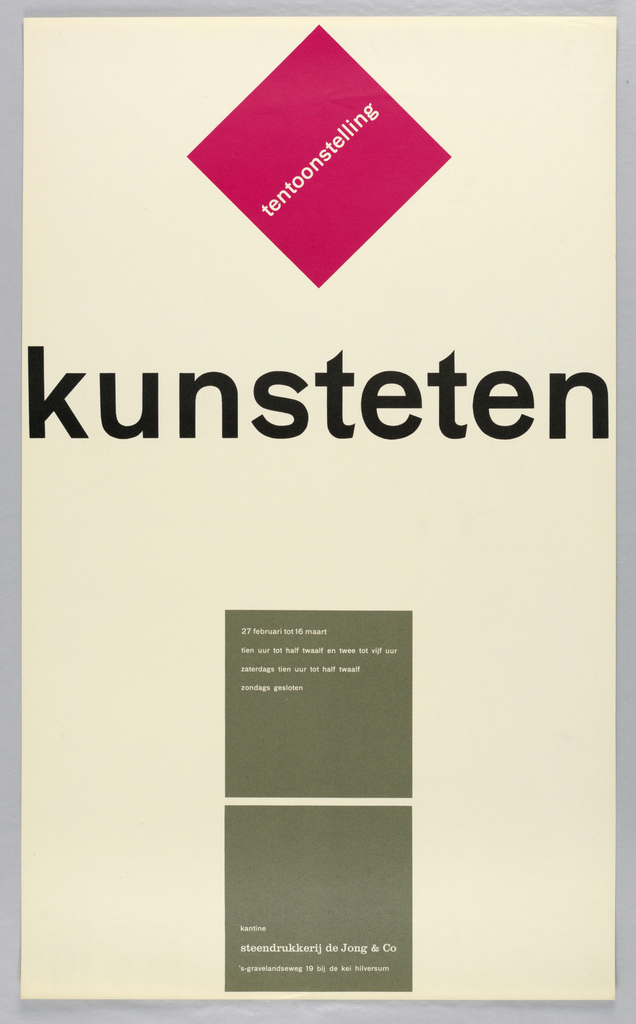 This is a Poster. It was designed by Pieter Brattinga. It is dated 1960 and we acquired it in 2000. Its medium is offset lithography. It is a part of the Drawings, Prints, and Graphic Design department.