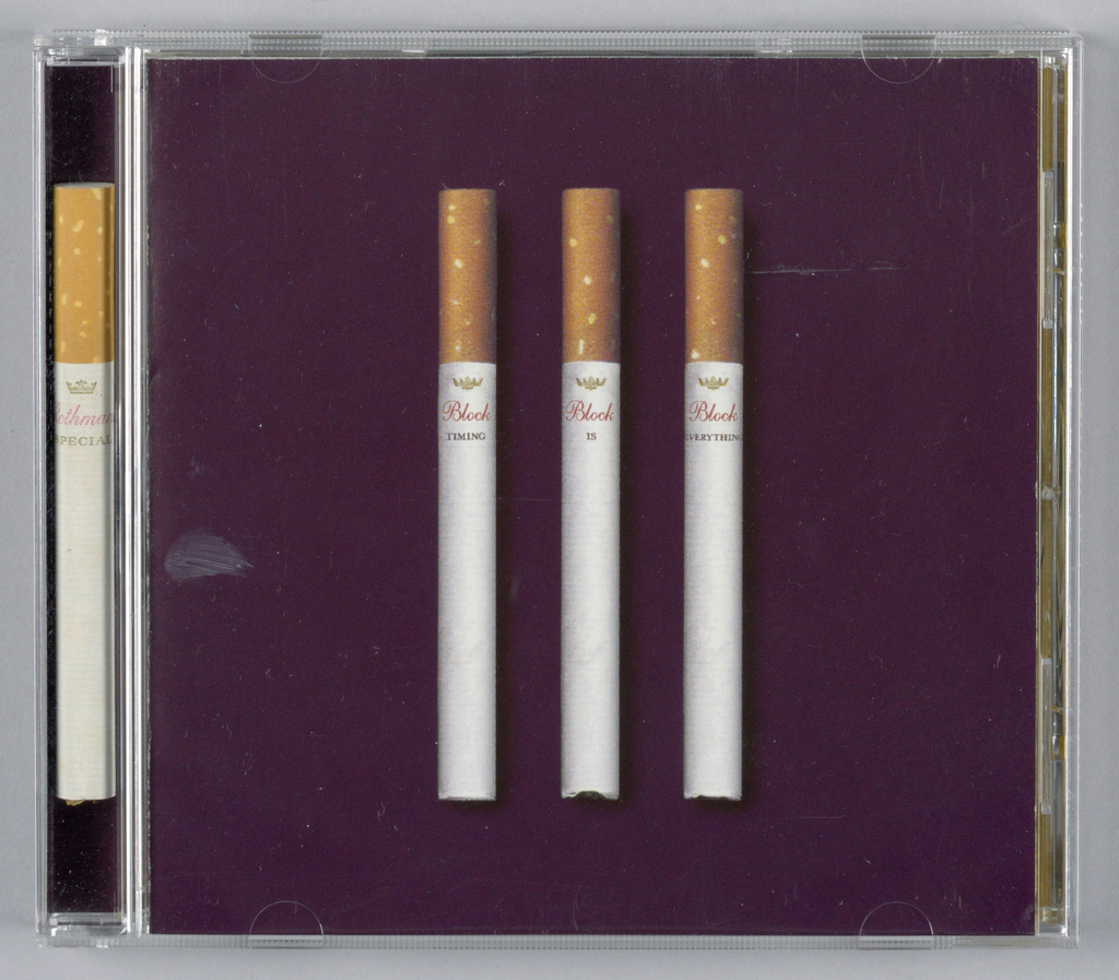 Compact Disc, Compact Disk Cover for Jamie Block's "Timing is Everything"; Designed by Stefan Sagmeister (Austrian, b. 1962), Hjalti Karlsson; Photographed by Susan Stava; Client: Capitol Records; USA; printed paper, plastic, and cigarette; 12.4 x 14.9 cm (4 7/8 x 5 7/8 in. ); Gift of Sagmeister, Inc.; 2000-61-8-a/c