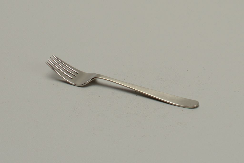 This is a fork. It was designed by Theresia Hvorslev and manufactured by A/S Norsk Staalpress and made for (as the client) SAS [Scandinavian Airlines System]. It is dated 1971 and we acquired it in 2001. Its medium is stainless steel. It is a part of the Product Design and Decorative Arts department.