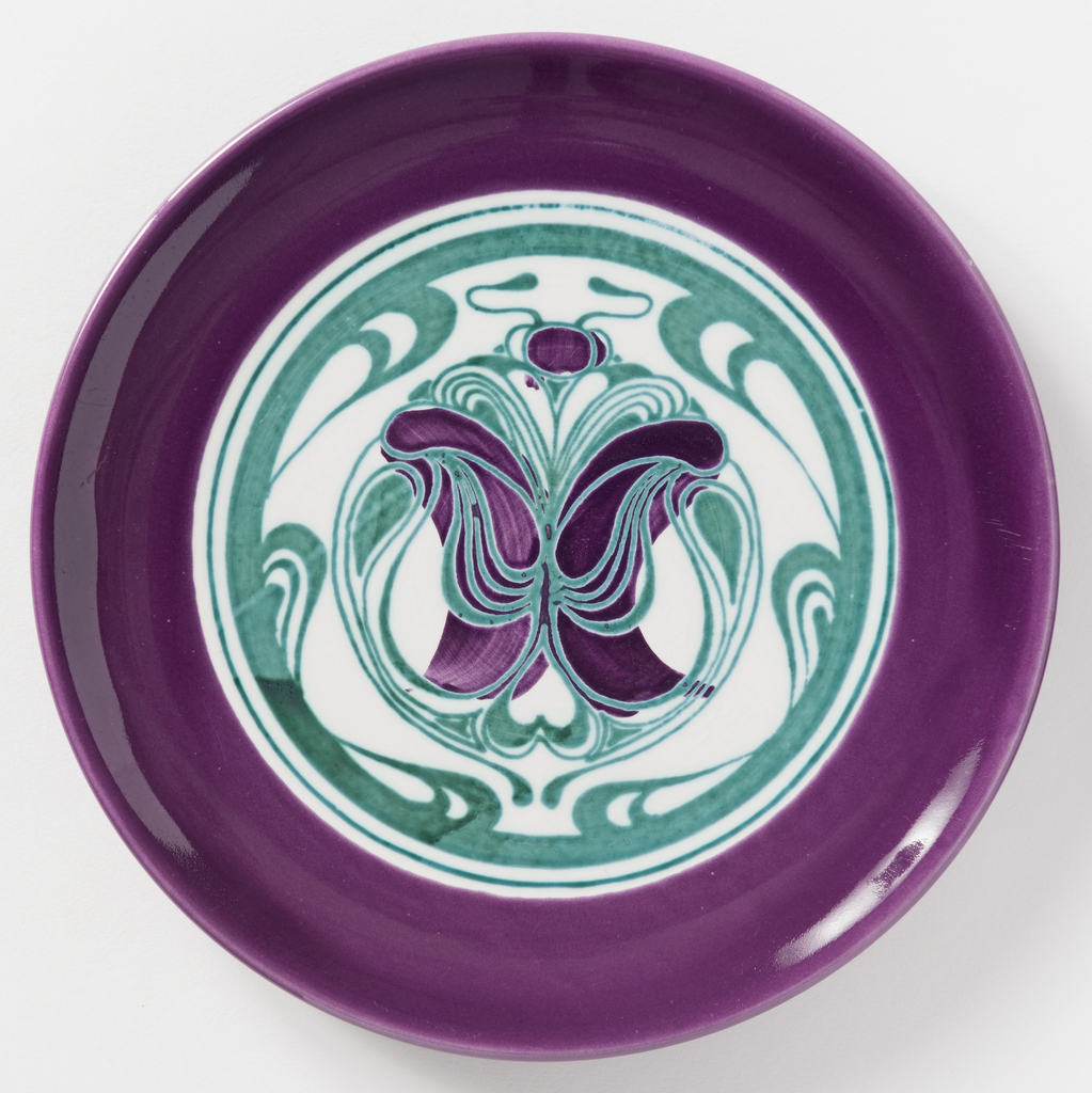 This is a plate. It was manufactured by Schramberger Majolikafabrik. It is dated ca. 1915 and we acquired it in 2001. Its medium is glazed earthenware. It is a part of the Product Design and Decorative Arts department.