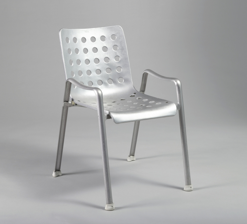 This is a chair. It was designed by Hans Coray and manufactured by P. and W. Blattmann Metallwarenfabrik. It is dated designed 1939; this example manufactured after 1961 and we acquired it in 2001. Its medium is aluminum, rubber. It is a part of the Product Design and Decorative Arts department.