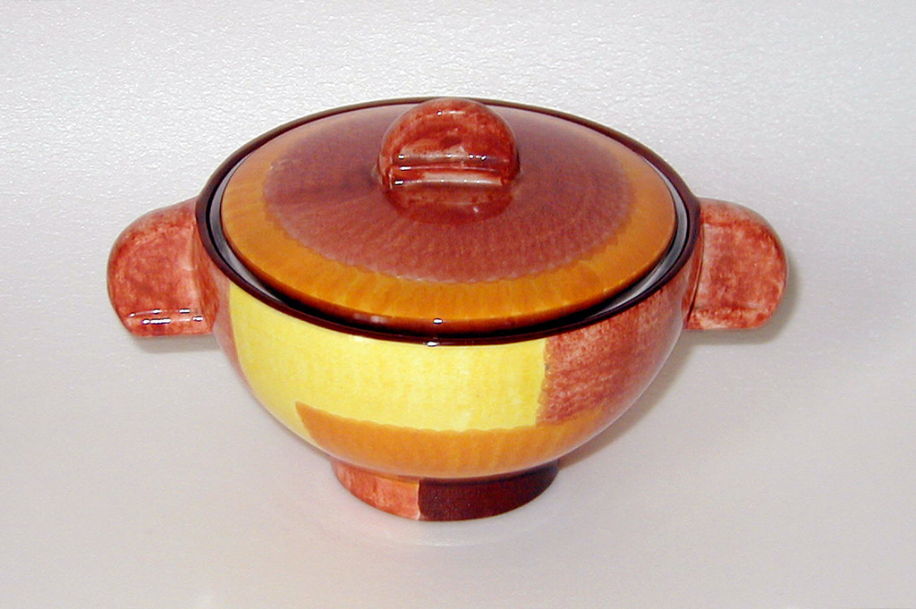 This is a sugar bowl. It was designed by Eva Zeisel and manufactured by Schramberger Majolikafabrik. It is dated 1928–1930 and we acquired it in 2002. Its medium is earthenware. It is a part of the Product Design and Decorative Arts department.