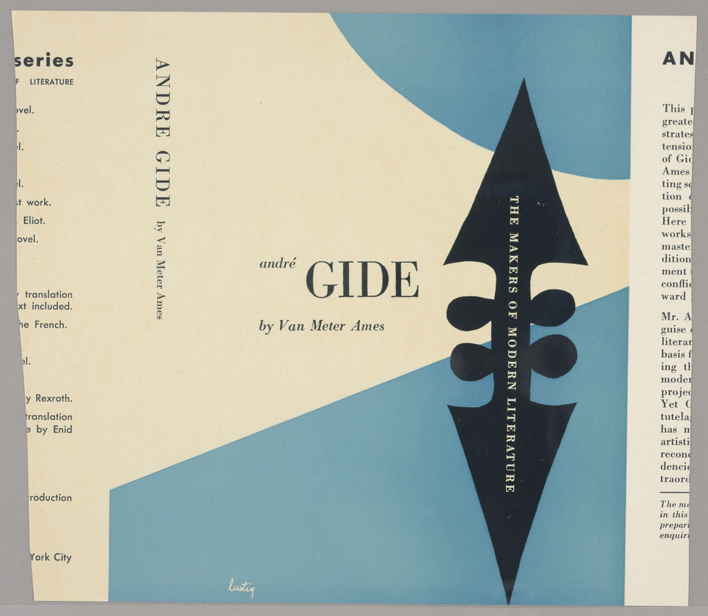 Book Cover, André Gide by Van Meter Ames; Graphic design by Alvin Lustig (American, 1915–1955); USA; offset lithograph on cream coated paper; 18.4 x 21.0 cm (7 1/4 x 8 1/4 in. ), irregular; Gift of Susan Lustig Peck; 2001-29-29