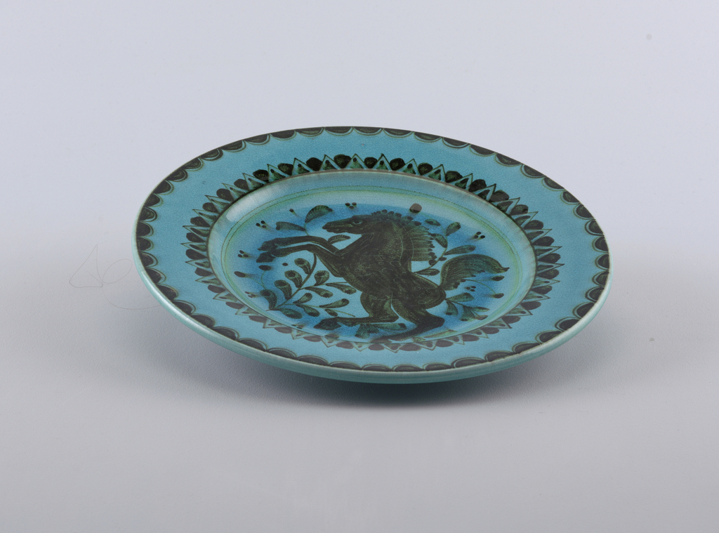 This is a Charger. It was designed by Paul Speck and manufactured by Karlsruhe Maiolica Factory. It is dated ca. 1930 and we acquired it in 2001. Its medium is glazed earthenware. It is a part of the Product Design and Decorative Arts department.