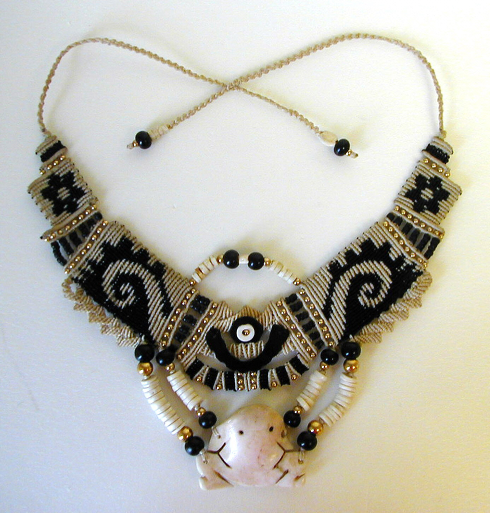 Witt’s neckpieces usually begin with a special ornament, or with the interests of a particular client. She works closely with both the object and her client. The whole composition, motifs, and color scheme of a necklace will revolve around the form and meaning of a central antique bead or talisman. Once the nylon threads are hand dyed, Witt chooses the weaving, knotting, or lace-making techniques to best complement the central ornament. Other beads or ornaments are subsequently chosen to strengthen the theme.