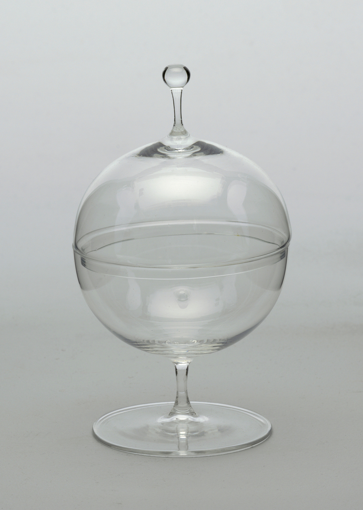 Ambassador Nut Dish And Cover; Austria; mouth-blown crystal ("muslin glass"); H x diam. (overall): 13.8 x 7.8 cm (5 7/16 x 3 1/16 in.) H x W x D (base): 6.9 x 8 x 8 cm (2 11/16 x 3 1/8 x 3 1/8 in.) H x W x D (top): 7 x 8 x 8 cm (2 3/4 x 3 1/8 x 3 1/8 in.); Museum purchase through gift of Georgiana L. McClellan; 1958-98-25-a,b